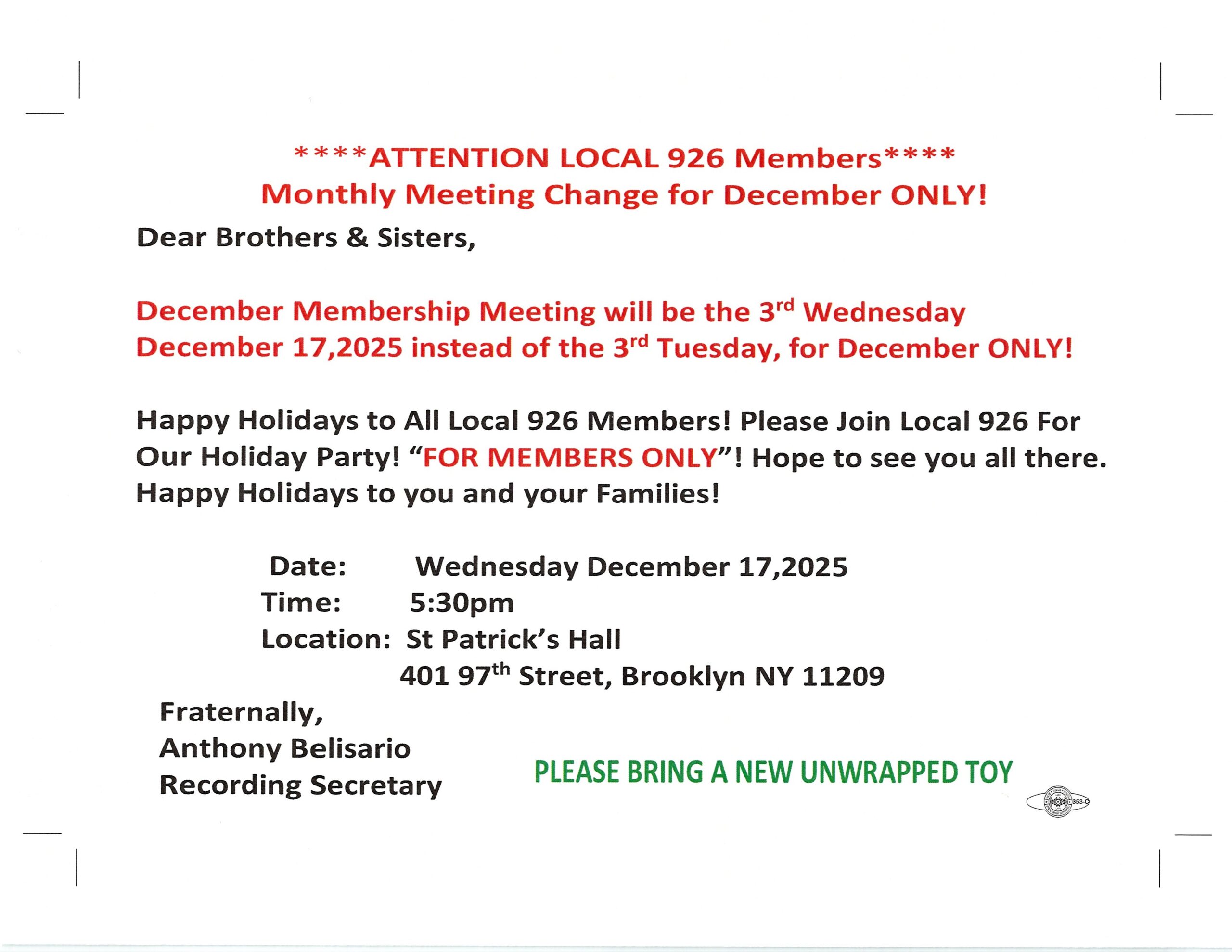 Next Meeting & Local 926 Holiday Party Will Be Wednesday December 17 ,2025 at 5:30 pm !